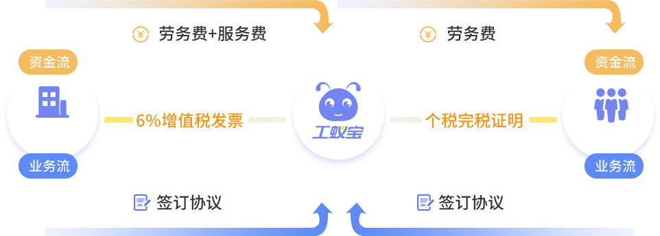 共享經濟下,工蟻寶作為用工智能撮合平臺,完成發包、接單、執行、審核、結算、報稅等一體化管理。 企業通過工蟻寶平臺發包(發任務),靈工通過平臺接包(接任務),建立起業務合作關系;企業通過平臺支付靈工的費用,并拿到增值稅專票;然后平臺代扣代繳個稅后,給靈工發放費用;最終做到合同流、業務流、資金流、票據流,四流一致,合理合規降低企業成本。
